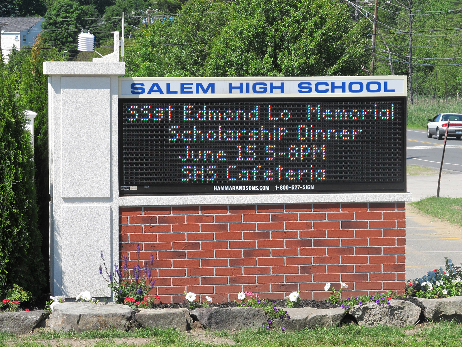 A posting of the memorial scholarship dinner on the Salem High School sign.